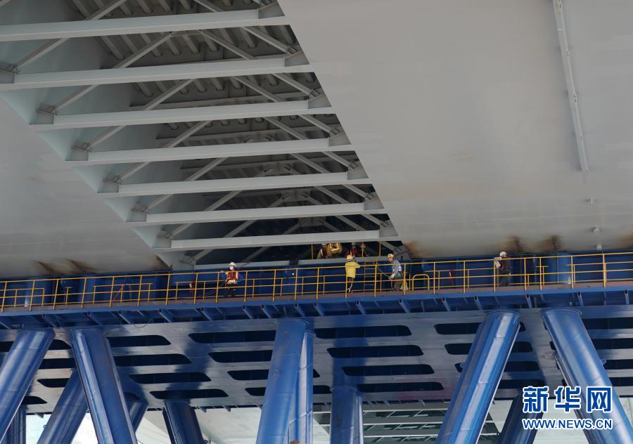 大橋由多個(gè)大型鋼鐵及混凝土構(gòu)件組成,這些組件均在內(nèi)地工廠生產(chǎn),分別來自江蘇南通、廣東新會(huì)和番禺,組件中最大的“家伙”就是眼前這個(gè)萬噸雙拱鋼橋。
