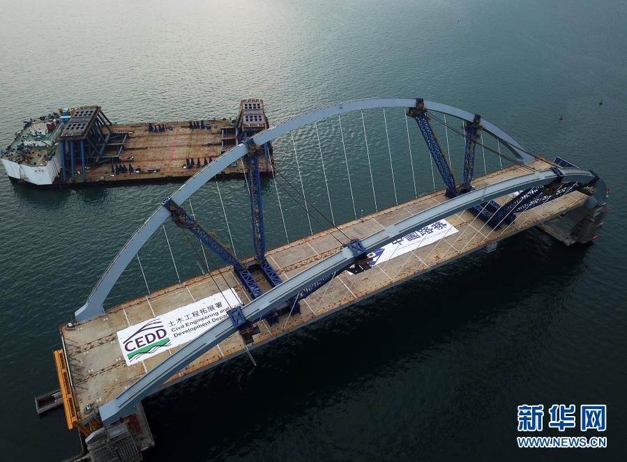 2月26日,從早晨7時(shí)開始,歷時(shí)5個(gè)小時(shí),首次利用海潮漲落的“浮托法”,70多位現(xiàn)場施工人員經(jīng)過緊張調(diào)試,將內(nèi)地預(yù)制好的雙拱鋼橋精準(zhǔn)對(duì)接并安裝在橋墩上。