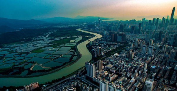無(wú)人機(jī)拍攝的深圳和香港落馬洲河套地區(qū)及周邊風(fēng)光(2018年5月23日攝)。新華社記者 毛思倩 攝
