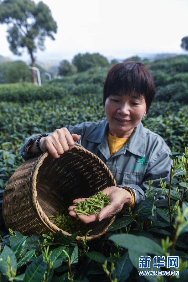 3月12日,在位于杭州市西湖風(fēng)景名勝區(qū)滿(mǎn)覺(jué)隴村白鶴峰的西湖龍井茶葉基地,茶農(nóng)展示剛剛采摘的西湖龍井茶鮮葉。