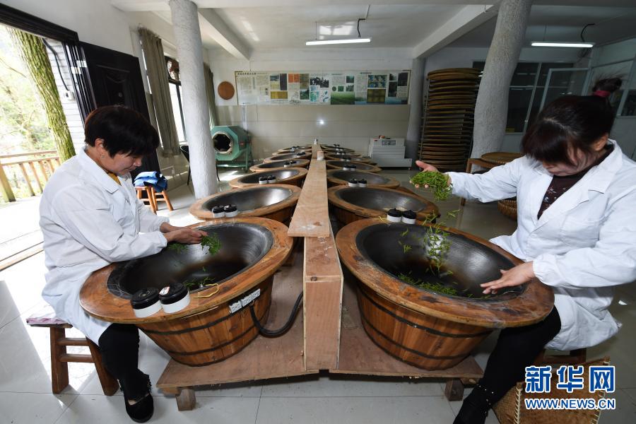 3月12日,在杭州市西湖風景名勝區(qū)滿覺隴村的中國茶葉博物館滿覺隴炒茶中心內(nèi),茶農(nóng)在手工炒制西湖龍井茶。