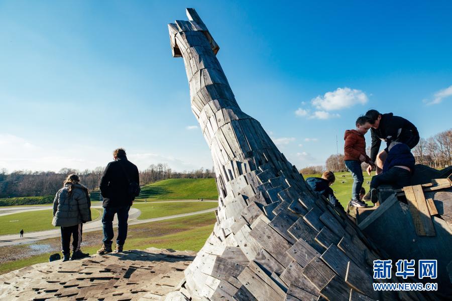 3月20日,人們?cè)诒壤麜r(shí)博姆市的德舒爾森林公園和一座“巨人”雕塑“玩?!?。新華社記者 張鋮 攝