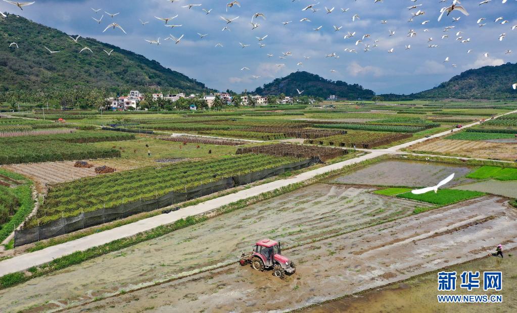 4月5日,海南省陵水黎族自治縣光坡鎮(zhèn)的農(nóng)民在田間勞作(無(wú)人機(jī)照片)。
