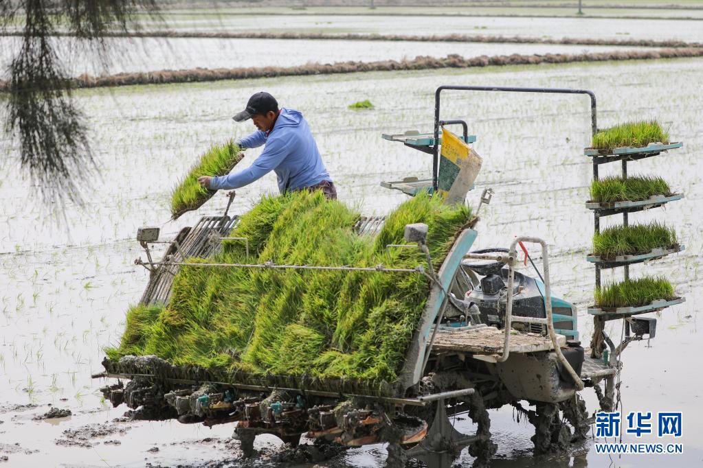 4月5日,在福建省晉江市九十九溪水稻高效栽培科技示范基地,工作人員將秧苗擺放在插秧機上。