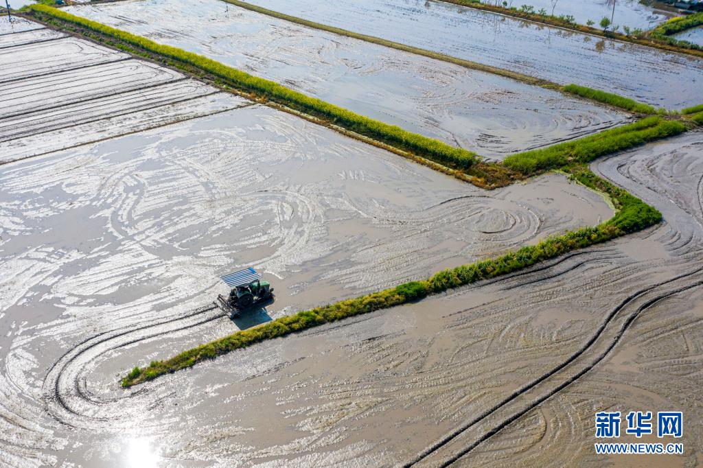 4月5日,浙江寧波余姚市黃家埠鎮(zhèn)韓夏村村民駕駛農(nóng)機(jī)在田間耕地(無人機(jī)照片)。