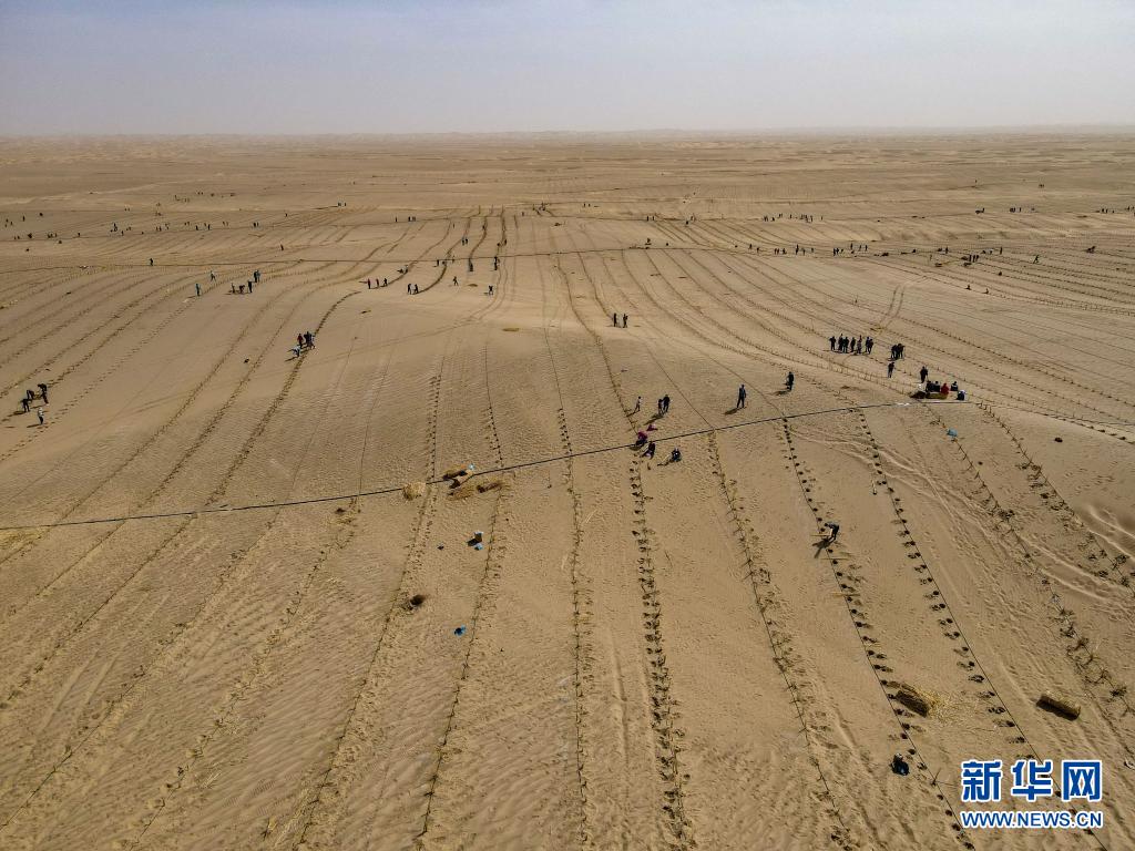 這是在新疆且末縣城不遠(yuǎn)處的塔克拉瑪干沙漠內(nèi)植樹(shù)的群眾(3月28日攝,無(wú)人機(jī)照片)。新華社記者 高晗 攝