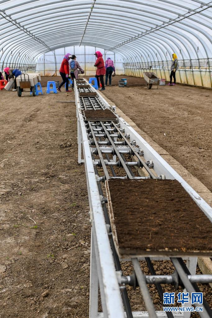 在吉林省吉林市永吉縣九月豐家庭農(nóng)場,水稻育秧生產(chǎn)線將種好種子的秧盤送到農(nóng)民手中(4月13日攝)。新華社記者 張楠 攝