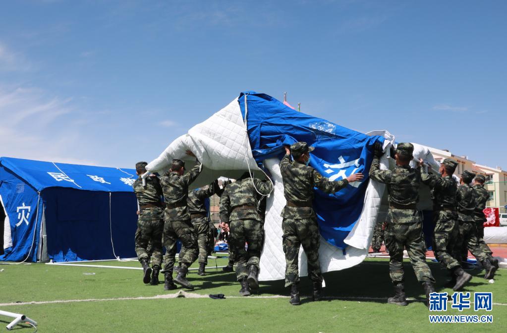 5月24日,武警青??傟牴逯ш牂C(jī)動大隊官兵為花石峽鎮(zhèn)藏文中心寄宿制小學(xué)搭建帳篷教室。新華社記者 劉新 攝