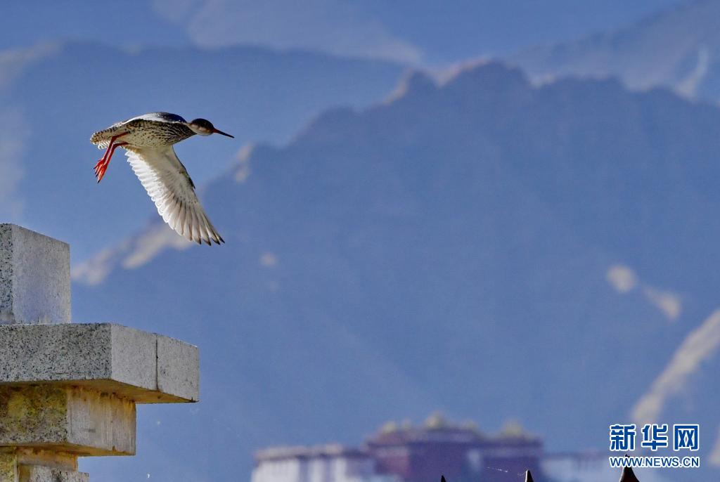初夏,紅腳鷸在位于西藏拉薩的拉魯濕地國家級自然保護區(qū)內起舞覓食。