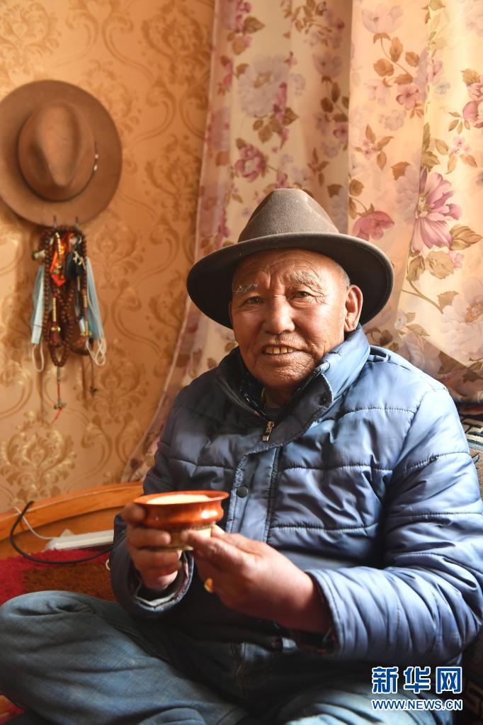 在西藏拉薩堆龍德慶區(qū)特困人員集中供養(yǎng)中心,一位老人在品嘗使用低氟“健康茶”制作的酥油茶(4月27日攝)。新華社記者 孫瑞博 攝