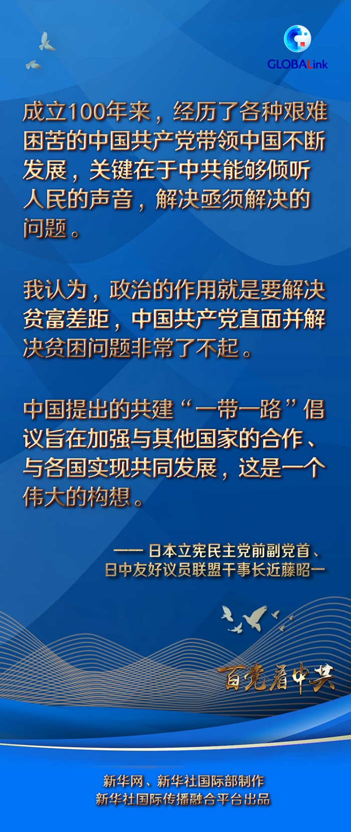 1996年首次當(dāng)選日本國會眾議員至今,近藤訪華70余次,見證了中國發(fā)生的巨大變化。從政以來,他越來越深刻地感受到,“中國共產(chǎn)黨的宗旨是為人民服務(wù),中國的發(fā)展是在中國共產(chǎn)黨的領(lǐng)導(dǎo)下實現(xiàn)的”。