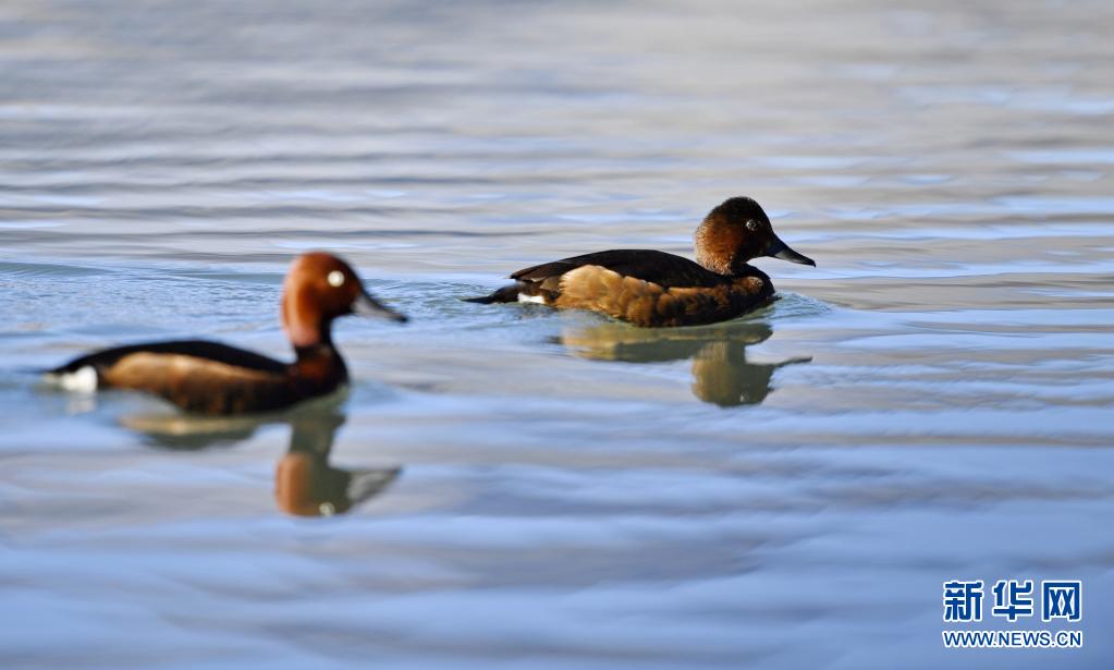 6月14日在拉魯濕地拍攝的兩只小??。夏日里,鳳頭??和小??在西藏拉薩拉魯濕地國家級自然保護(hù)區(qū)水面上嬉戲。新華社記者 張汝鋒 攝