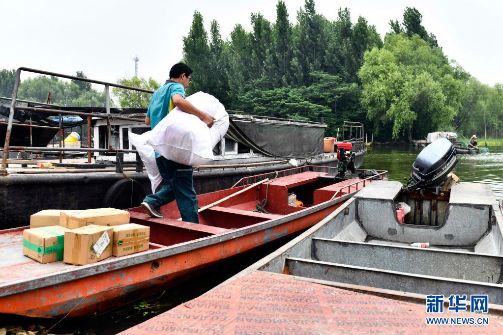 6月20日,在微山縣南陽鎮(zhèn),郵遞員王少朋往郵船上裝郵件,準備為村民投遞。