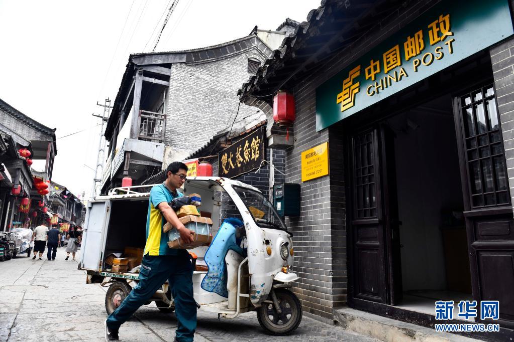 6月20日,在微山縣南陽(yáng)鎮(zhèn),郵遞員王少朋在搬卸郵件。