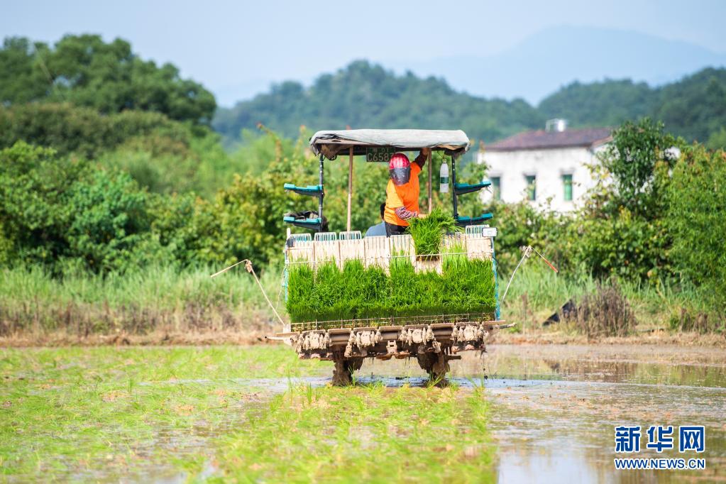 6月26日,湖南瀏陽(yáng)龍伏鎮(zhèn)新開(kāi)村村民駕駛插秧機(jī)在田間插秧。