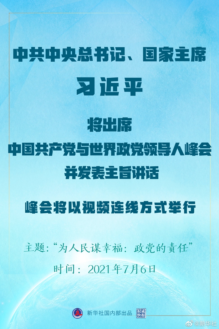 中共中央對(duì)外聯(lián)絡(luò)部發(fā)言人胡兆明5日宣布,中國(guó)共產(chǎn)黨與世界政黨領(lǐng)導(dǎo)人峰會(huì)將于7月6日以視頻連線方式舉行,中共中央總書記、國(guó)家主席習(xí)近平將在北京出席會(huì)議并發(fā)表主旨講話。此次會(huì)議的主題為“為人民謀幸福:政黨的責(zé)任”,160多個(gè)國(guó)家的500多位政黨和政治組織等領(lǐng)導(dǎo)人以及逾萬名政黨代表等將出席會(huì)議。