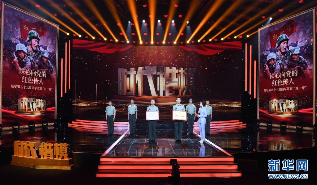 在“時代楷模”發(fā)布儀式上,陸軍第八十三集團軍某旅“紅一連”官兵代表領取“時代楷?!豹勁坪妥C書(7月23日攝)。新華社記者 張永進 攝