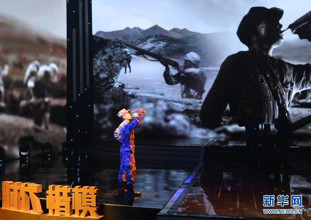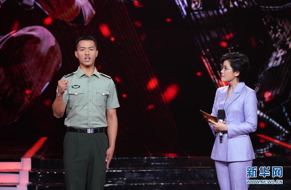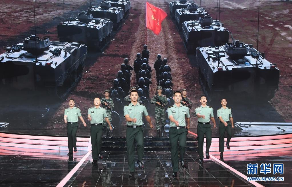 在“時代楷?!卑l(fā)布儀式上,陸軍第八十三集團軍某旅“紅一連”官兵代表表演節(jié)目《紅色堡壘》(7月23日攝)。新華社記者 張永進 攝
