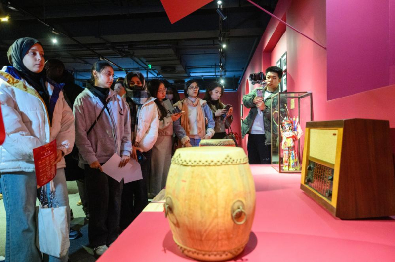 1月26日,在北京市朝阳区戏曲艺术中心,中外观众参观“百年风华·国粹新声”京剧艺术主题展上展出的乐器。