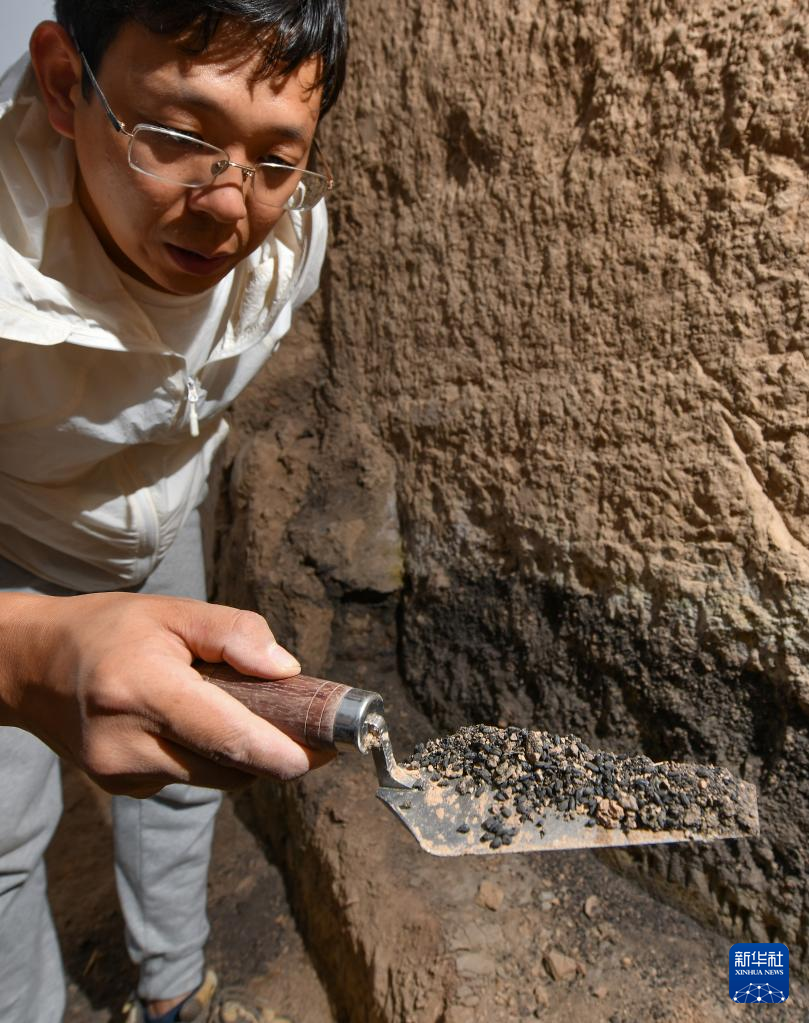 在甘肃庆阳市南佐新石器时代遗址核心区大型宫殿建筑发掘现场,考古队员展示炭化水稻遗存(2022年8月23日摄)。