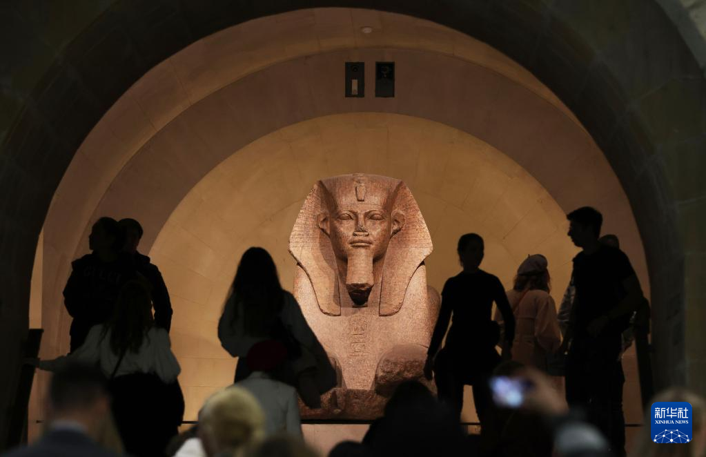 3月22日,在法国巴黎卢浮宫,人们穿过钟阁走进古埃及文物展厅。