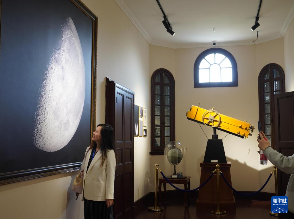 4月27日,观众在40厘米口径大双筒折射望远镜1901年拍摄的月球表面照片前留影。
