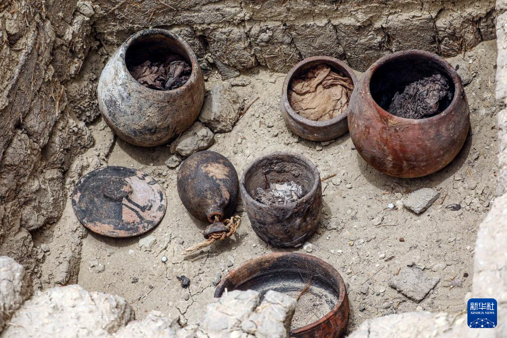 这是5月27日在埃及塞加拉地区考古挖掘现场拍摄的在木乃伊制作过程中用到的陶罐。