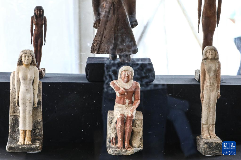这是5月27日在埃及塞加拉地区举行的考古新闻发布会上拍摄的出土文物。