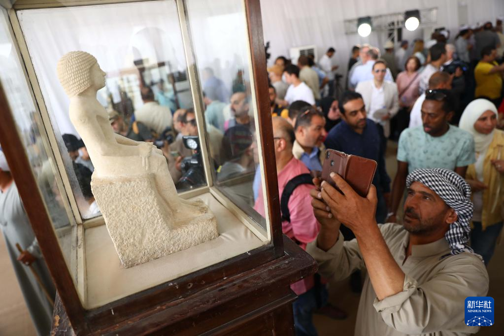 5月27日,在埃及塞加拉地区举行的考古新闻发布会上,一名男子拍摄展出的文物。