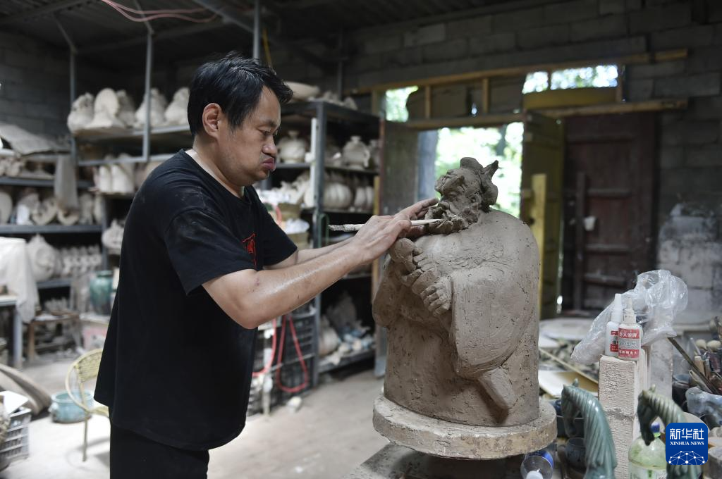 8月3日,在河南省禹州市神垕镇槐树湾村陶瓷创客基地,钧瓷艺人杨根成在自己的工作室里创作钧瓷作品。