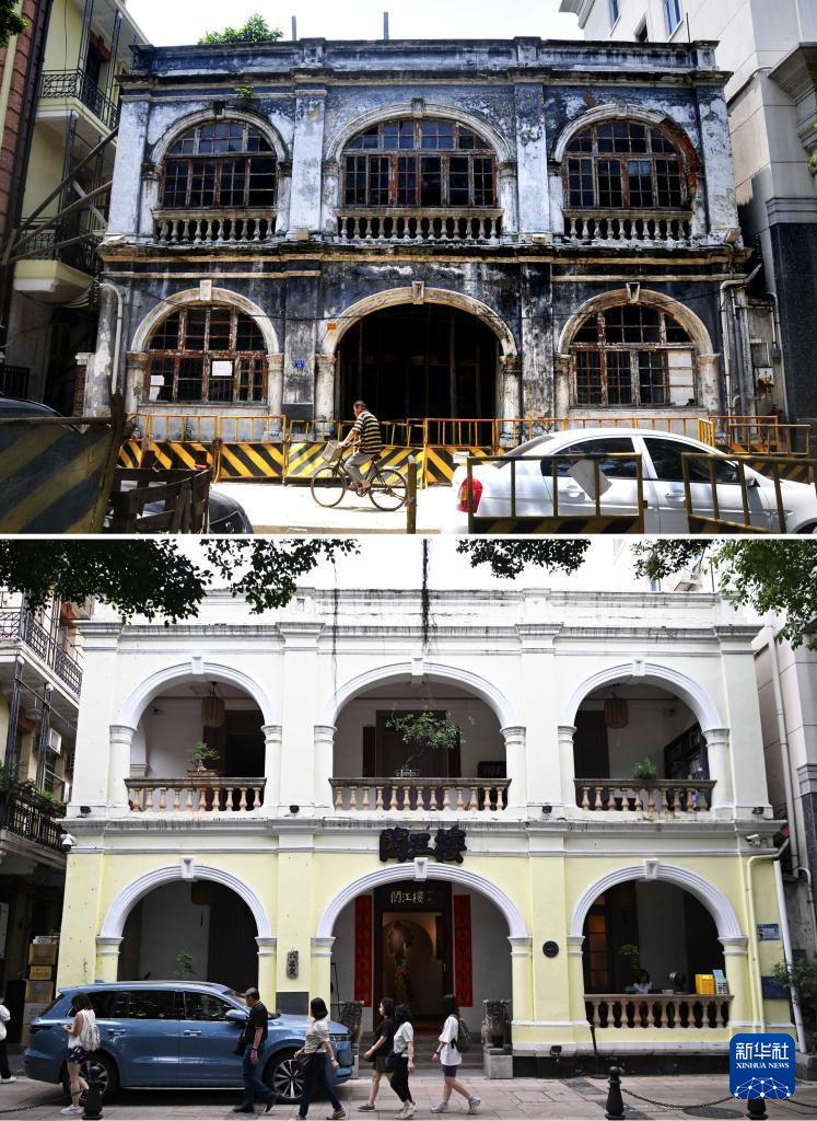拼版照片:上图为2010年5月25日拍摄的广州沙面北街43号(资料照片)。下图为2024年4月17日拍摄的修缮后的广州沙面北街43号(新华社记者邓华摄)。