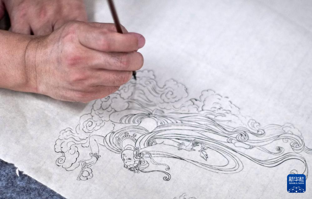 朱江在绘制雕漆作品线稿(6月5日摄)。