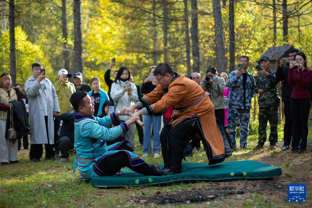 9月12日,在新生鄂伦春族乡新生村的民俗体验区,两名鄂伦春青年进行“拉杠”比赛。