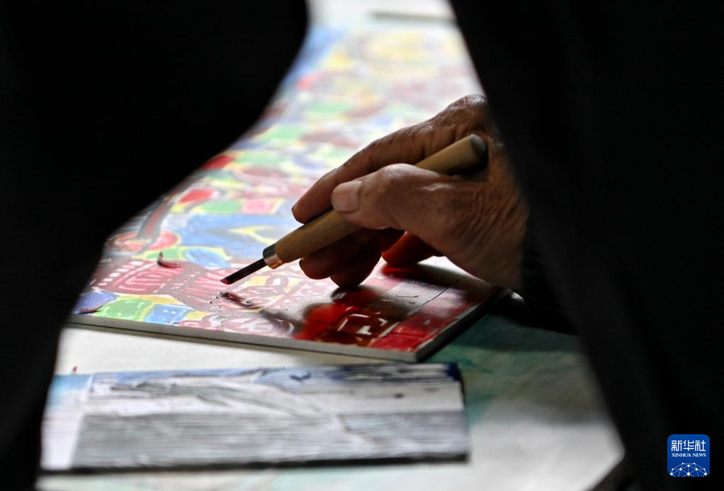12月9日,在云南普洱学院那柯里绝版木刻教学实践基地,绝版木刻画师在进行版画创作。