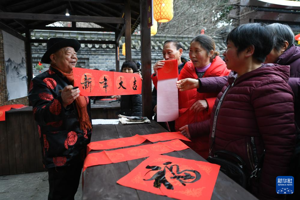 1月7日,书法爱好者在阆中古城向人们赠送春联。