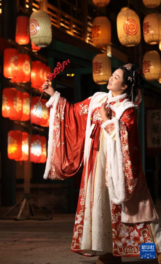 1月21日,民间艺人在湖北省襄阳市唐城景区表演舞蹈。