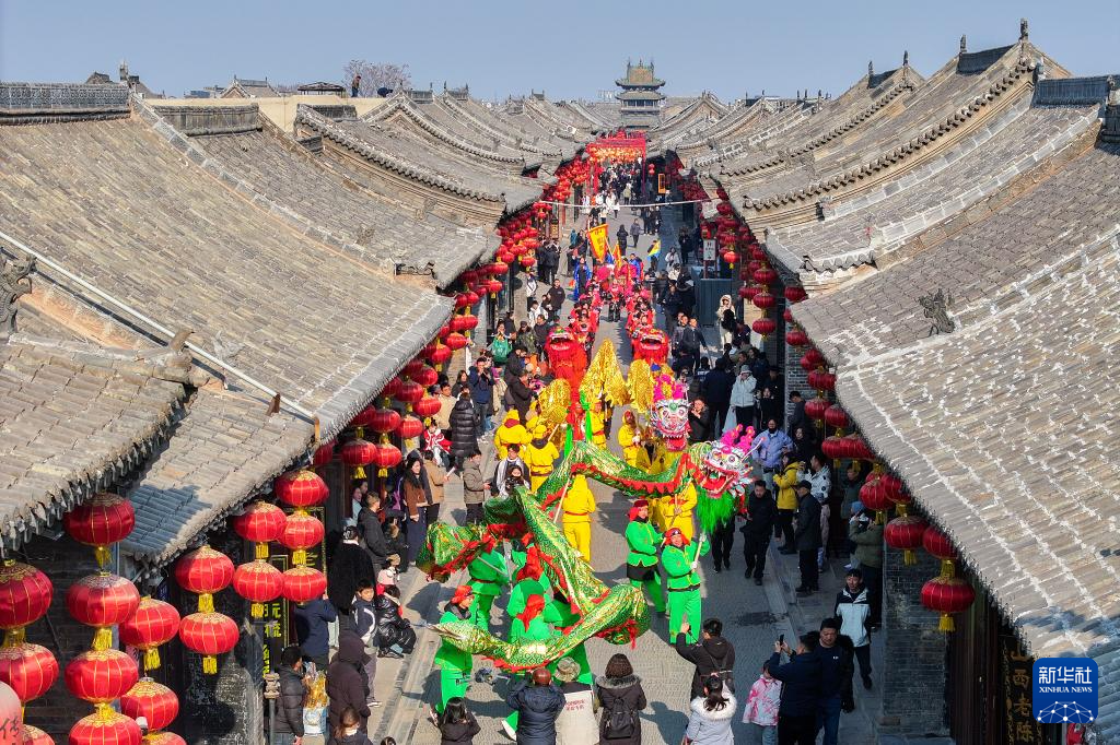 1月22日,民间艺人在山西省晋中市平遥县平遥古城内表演舞龙。