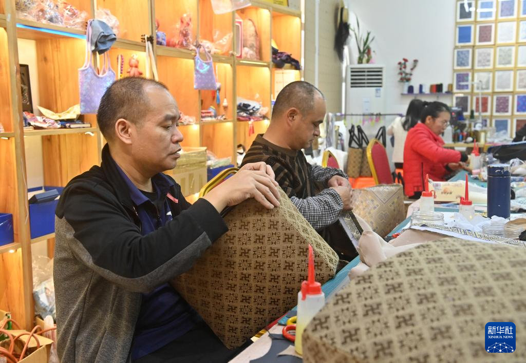 12月17日,在广西宾阳壮锦文创馆,工人制作壮锦文创产品。
