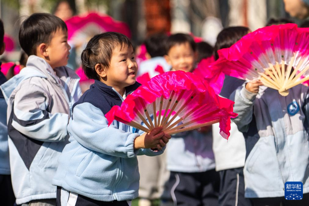 1月13日,在南县第三实验幼儿园,学生在课间练习南县地花鼓。