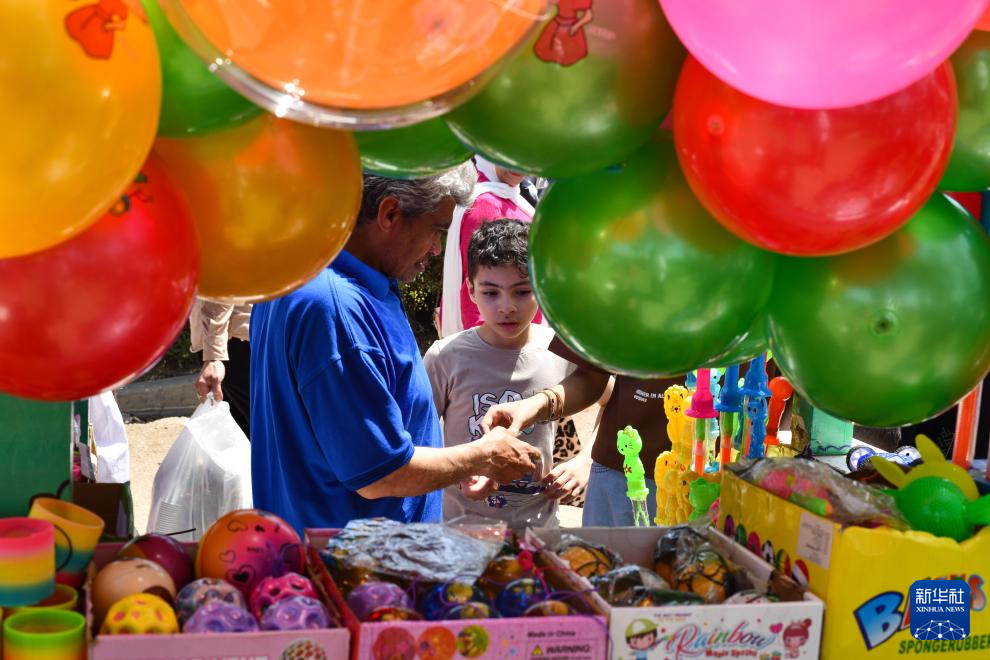 4月13日,儿童在埃及首都开罗的爱资哈尔公园购买玩具。