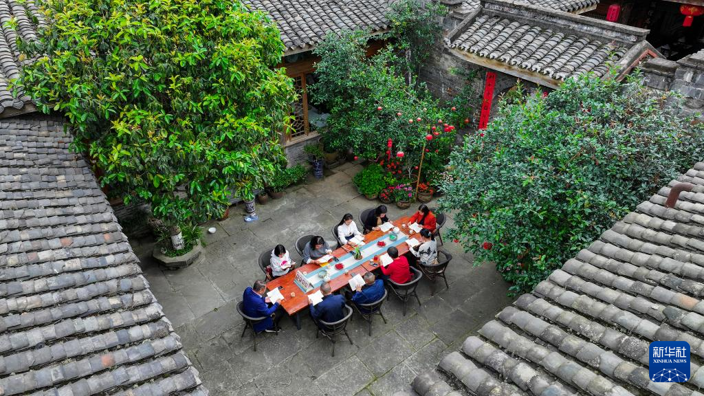 4月14日,四川省阆中市,“有声阅读”读书会的阅友在阆中古城土生金客栈诵读经典(无人机照片)。