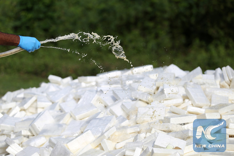 A police officer sprays gasoline on packages of cocaine, seized from a ship stopped in international waters. (Reuters photo)