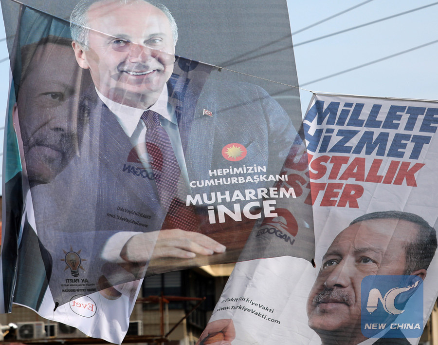 Banners of Turkish President Recep Tayyip Erdogan and a banner of Muharrem Ince, presidential candidate of the main opposition Republican People's Party hang in a street in Istanbul, Turkey, on June 16. (Reuters photo)