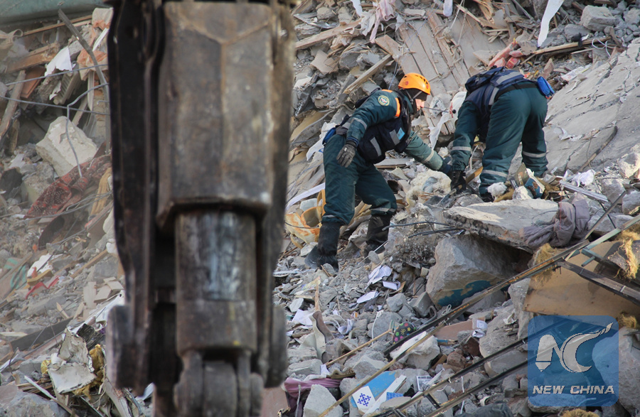 Russian Emergency Situations Ministry personnel work at the explosion-rocked residential building in the city of Magnitogorsk, Russia, Jan. 2, 2019. (Xinhua/Sputnik)