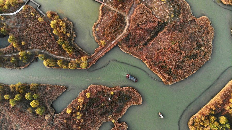Aerial photo taken on Nov. 18, 2019 shows a view of the Jixi national wetland, located in western Jinan, east China's Shandong Province.(Xinhua/Wang Kai)