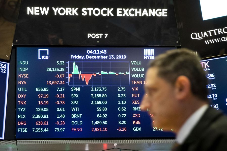 An electronic screen shows the trading data at the New York Stock Exchange in New York, the United States, on Dec. 13, 2019. (Xinhua/Wang Ying)