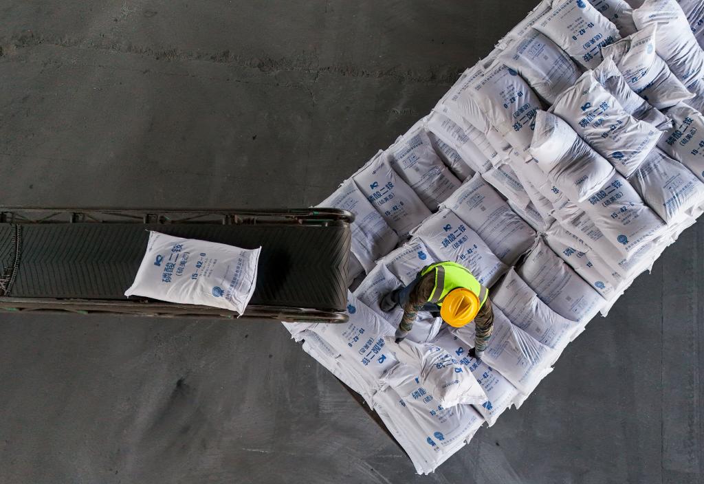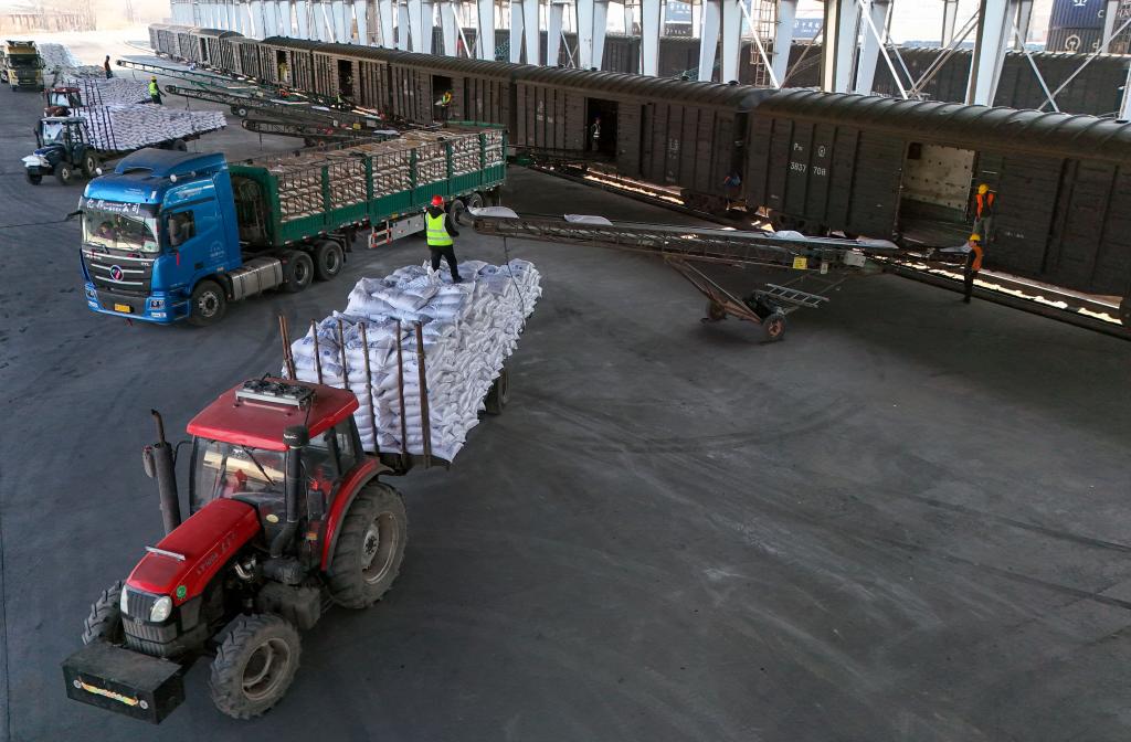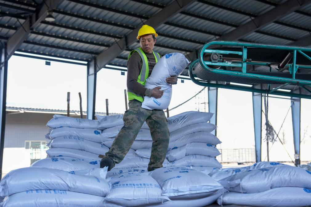 A worker unloads fertilizers at the Suihua business department of Harbin Railway Logistics Center in Suihua, northeast China's Heilongjiang Province, March 17, 2026. (Xinhua/Wang Song)