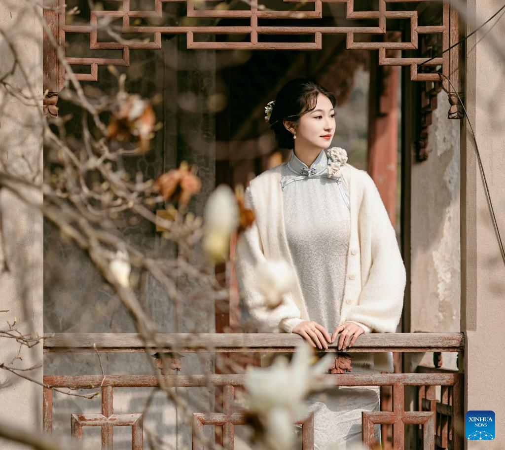 This undated file photo shows a woman dressed in qipao, posing for photos at the ancient town of Yongquan Town, Linhai City, east China's Zhejiang Province. (Xinhua)
