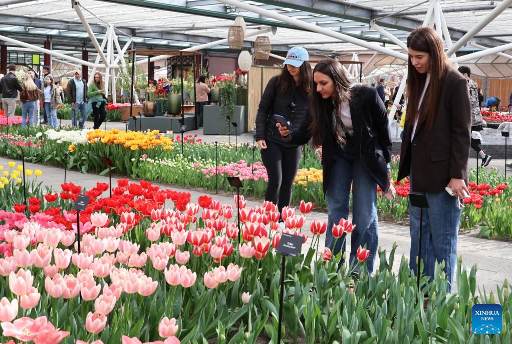 People take pictures of blooming tulips at the Keukenhof park in Lisse, the Netherlands, on March 19, 2026. The park is open to the public from March 19 to May 10 this year. (Photo by Sun Jingjing/Xinhua)