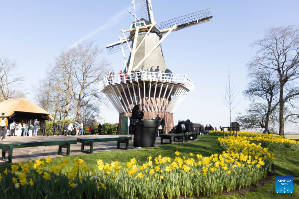 A windmill is pictured at the Keukenhof park in Lisse, the Netherlands, on March 19, 2026. The park is open to the public from March 19 to May 10 this year. (Photo by Sylvia Lederer/Xinhua)